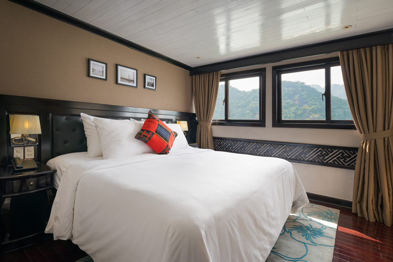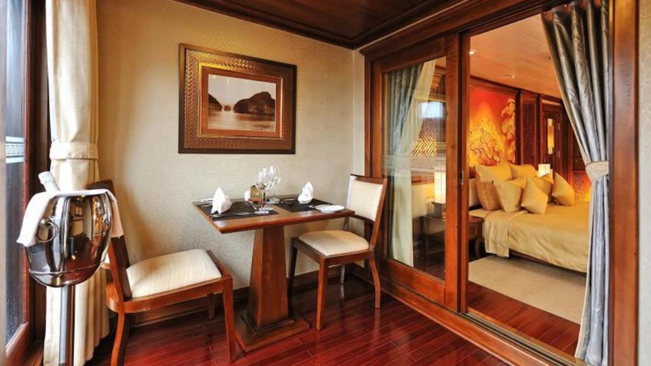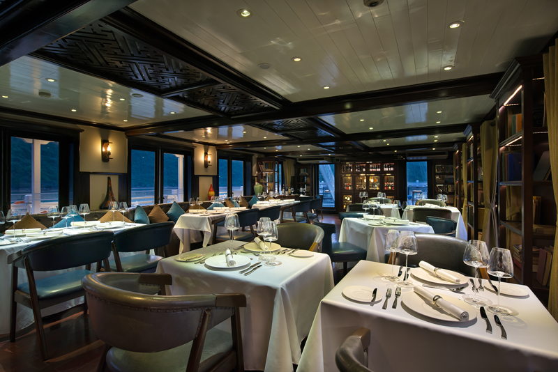 Không chỉ vậy, du thuyền còn xây dựng nhà hàng và quầy bar sang chảnh trên tầng 3 để du khách có thể thưởng thức những món ăn ngon tuyệt hảo, nhâm nhi ly rượu vang trong không gian an yên, thanh bình giữa lòng di sản. Phòng spa và massage hiện đại sẽ giúp bạn có những phút giây thư giãn đích thực, xua tan mọi mệt mỏi của cuộc sống thường nhật.