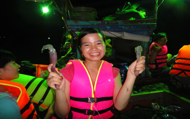 Từ trước khi đặt chân đến vịnh Hạ Long, chúng tôi đã biết đây là nơi có hệ sinh thái động thực vật phong phú, thế nhưng trải nghiệm câu mực buổi đêm vẫn là điều gì đó hết sức mới mẻ. Đặc biệt là với trẻ em, thay vì câu cá bình thường, các bạn đều rất tò mò, thích thú khi được tự tay câu chú mực biển trong màn đêm đen kịt của đại dương.