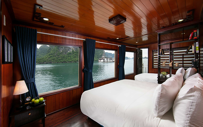 Căn phòng sang trọng của du thuyền Flamingo với cửa sổ để ngắm cảnh vịnh Hạ Long