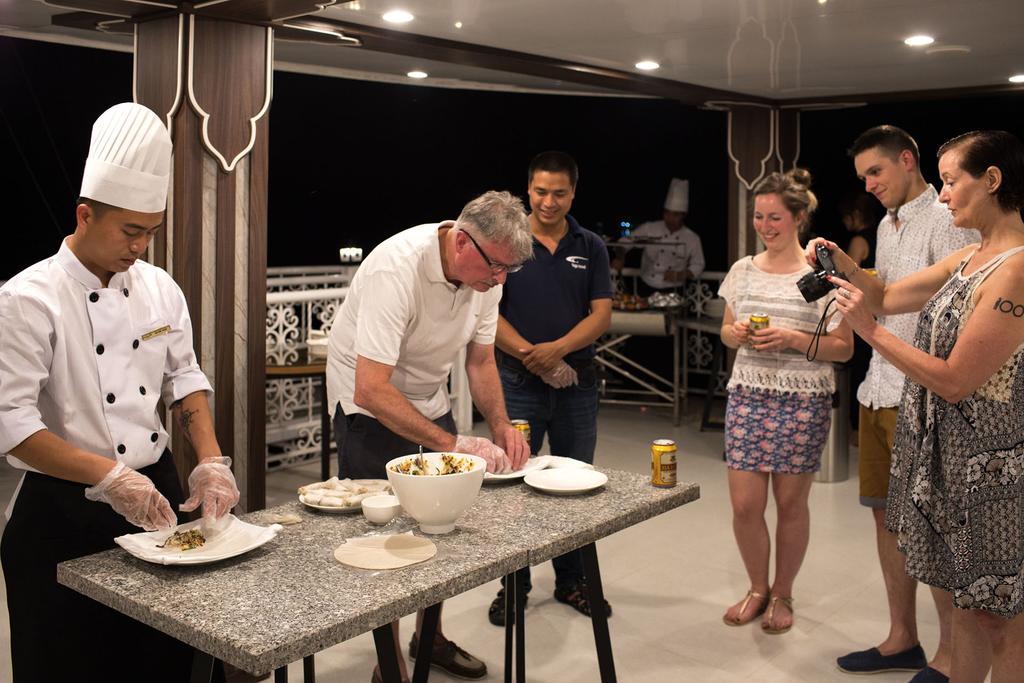 Tất cả những gì bạn cần chỉ là xem các đầu bếp chuyên nghiệp giới thiệu và hướng dẫn sau đó học theo và thực hiện các bước một cách hoàn chỉnh để có một thành phẩm hoàn chỉnh. Trong nửa giờ, bạn có thể tạo được một món ăn của riêng mình rồi. Một hoạt động rất thú vị trong tour du lịch Vịnh Hạ Long.