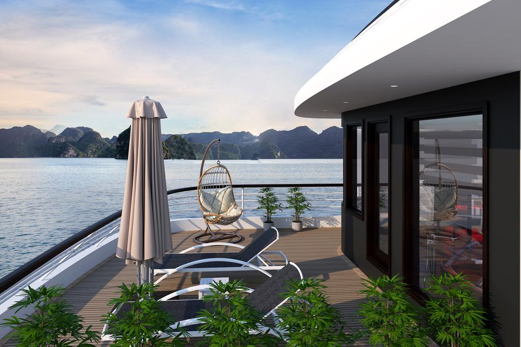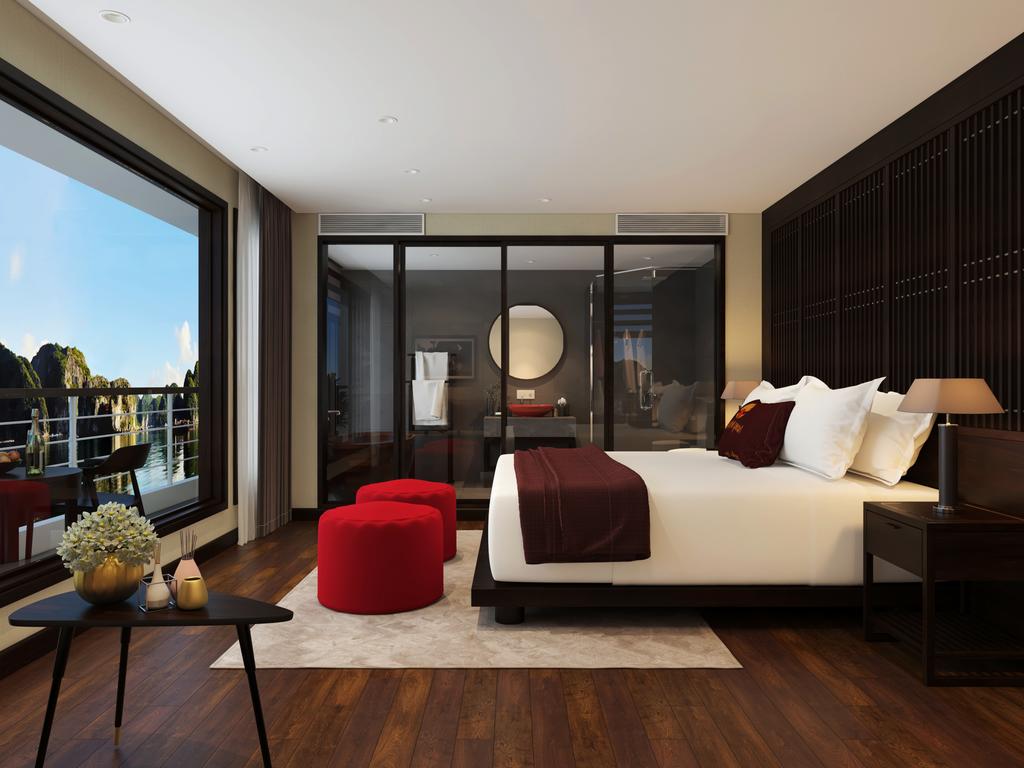 Ngoài việc trang bị nội thất phòng tiện nghi, mỗi cabin của Scarlet Pearl còn gây ấn tượng bởi việc bố trí các cửa sổ kính lớn và ban công rộng. Không gian trong phòng dễ dàng đón gió và nguồn ánh sáng tự nhiên tạo nên sự thoáng mát nhất định. Và hơn hết là bạn có thể tận hưởng sự an yên giữa lòng vịnh Lan Hạ, hít hà hương vị của biển từ ngay trong căn phòng của mình. Quá đáng giá đấy chứ!