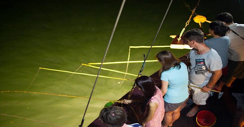 Câu mực đêm là một hoạt động khá thú vị mà bạn nên trải nghiệm, khi mặt trời chuẩn bị lặn các tàu câu mực cũng bắt đầu bật sáng, ánh sáng của hàng trăm chiếc bóng đèn cao áp là sáng rực cả một khoảng vịnh. Ở Hạ Long bạn có thể trải nghiệm việc câu mực khi ngủ đêm trên du thuyền. Hầu như các du thuyền đều có trang bị dụng cụ câu mực cho du khách trải nghệm. Một chiếc bóng đèn cao áp sẽ được gắn ở đuôi tàu gần mặt nước, khi nước chảy suôi chiều những đàn mực thi nhau chạy quanh bóng đèn, nhiệm vụ của bạn là việc nhấc lên đặt xuống cần câu làm sao cho chú mực háu ăn đuổi theo làm bám vào mồi. Chúc bạn sẽ trở thành một thợ câu mực cừ khôi với chiến lợi phẩm là một đĩa mực tươi được hấp ngay sau buổi câu.
