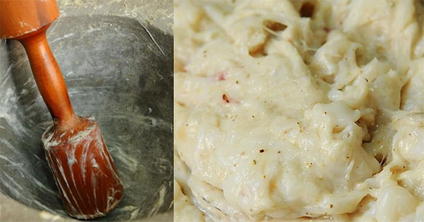 Những con mực mai to, tươi sống được chọn lọc kỹ càng, loại bỏ mai, râu đen, rửa sạch, được lau nhiều lần bằng khăn khô. Mực được cắt nhỏ từng miếng từ 3-5 cm sau đó cho vào cối giã bằng tay. Giã mực chỉ nên giã hơi rối, vừa đủ để tạo độ kết dính mà khi ăn tạo cảm giác sần sật thơm ngon. Thoạt nhìn những người thợ thạo việc vung chày lên xuống một cách nhẹ nhàng, người ta cứ tưởng đây là một việc không mấy gì khó khăn. Chỉ khi du khách xin một lần được trải nghiệm họ mới thấy rằng việc giã mực bằng tay không hề đơn giản như họ nghĩ. Những con mực khi được giã bắt đầu sệt lại, kết dính thành một hỗn hợp dẻo đặc như keo làm cho việc vung chày trở nên khá vất vả, chỉ những thợ quen tay mới có thể đảm đương nổi công đoạn này. Sau khi gia giảm những gia vị như: hạt tiêu bắc, bột nếp làm từ loại nếp cái hoa vàng, hành… thì mực sẽ được nặn thành từng miếng bỏ vào chảo mỡ rán vừa lửa.
