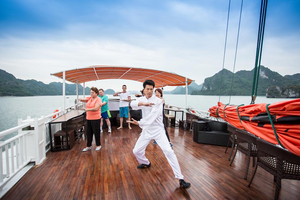 Đón bình minh trên vịnh trong không gian trong lành và tươi mới như thế này cùng 1 ly cafe ấm nóng chắc chắn sẽ mang đến cho bạn cảm giác thư giãn và thoải mái nhất. Bên cạnh đó, bạn cũng có thể bắt đầu ngày mới bằng những đường Thái Cực Quyền ngay trên boong tàu để vận động cơ thể, tạo hứng khởi cho chặng hành trình tiếp theo.