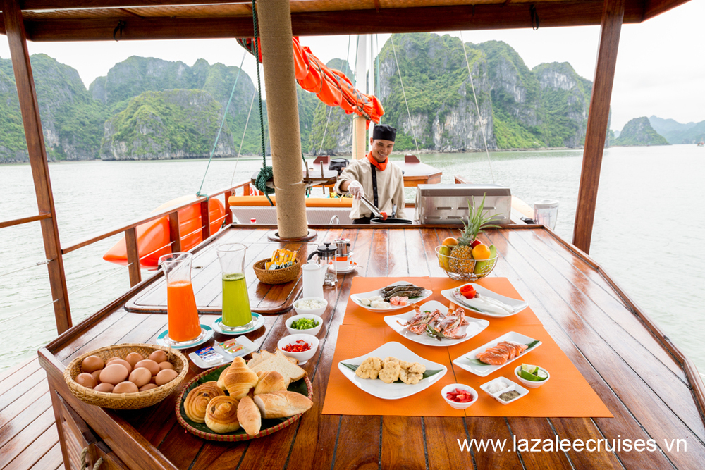 Nghỉ ngơi một chút, bạn sẽ dùng bữa trưa ngay trên du thuyền trong khi LAzalee nhổ neo đưa đoàn ra vùng biển giữa Đảo Cát Bà và Vịnh Hạ Long. Thực đơn bữa trưa vô cùng phong phú từ ẩm thực truyền thống cho tới Á - Âu mang đến cho bạn những lựa chọn, những món ăn tuyệt vời nhất.
