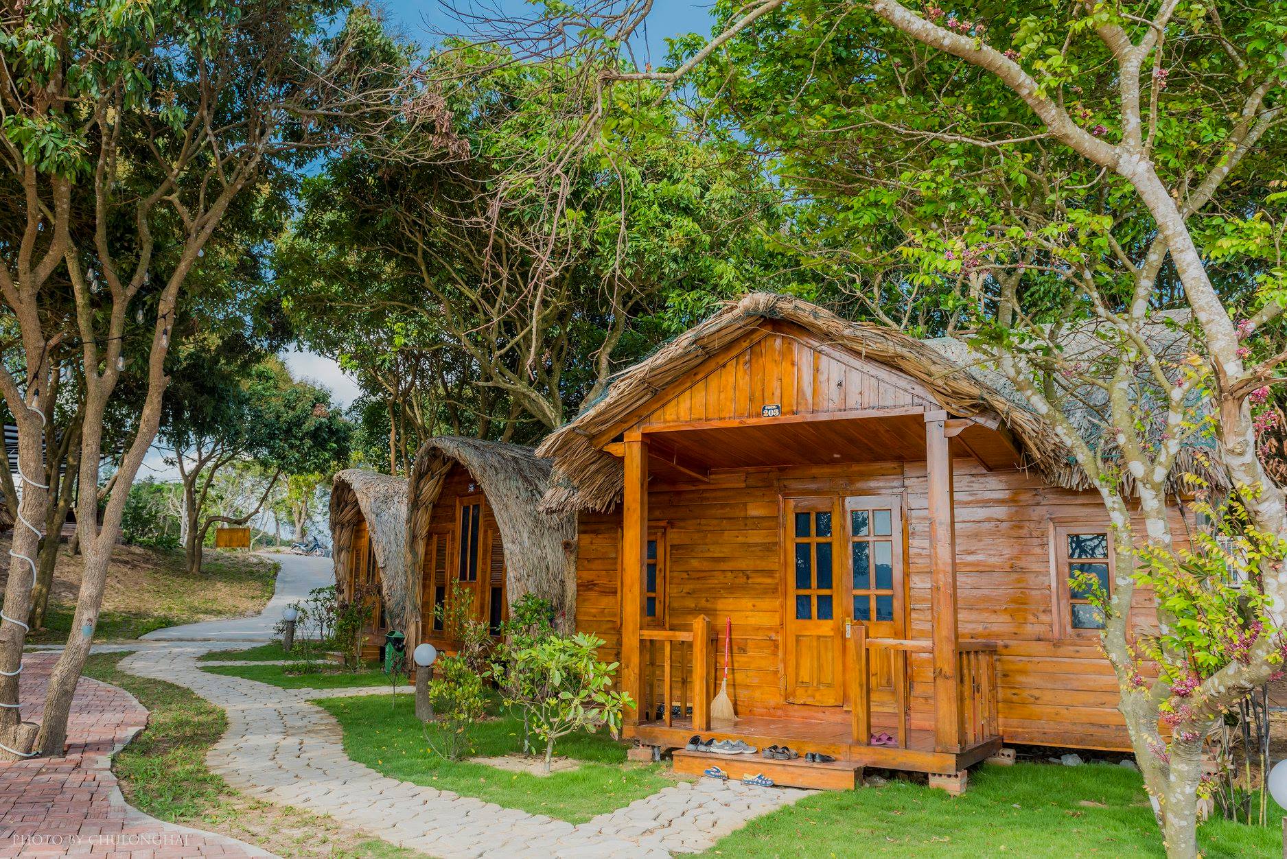 Những căn nhà gỗ mái lá có thiết kế độc đáo, sử dụng vật liệu thân thiện với môi trường. Mỗi ngôi nhà có dạng hình ống, lợp bằng rơm để làm mái, lấy gỗ làm cửa và khung, nằm cạnh nhau trong vòng cung. Phía trước là một sân thượng thoáng mát, những đường trắng trải nhựa trên thảm cỏ xanh và một chiếc giường lười nhìn ra phong cảnh.