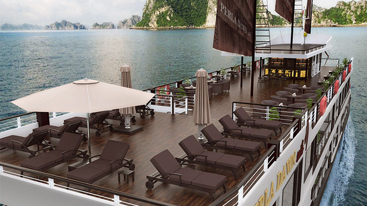 Ngoài hệ thống phòng ngủ tiện nghi, du thuyền Perla Dawn còn cung cấp cho du khách những dịch vụ giải trí, khu vực nghỉ ngơi sang trọng khác. Như boong tắm nắng trên tầng 3. Du khách có thể ngắm nhìn khung cảnh Vịnh Lan Hà trong khi ngâm mình dưới ánh nắng ấm áp của những ngày cuối hè, thưởng thức ly đồ uống trong khi trò chuyện cùng bạn bè, người thân. Hệ thống ghế ngồi cao cấp được phục vụ miễn phí sẽ là địa điểm nghỉ ngơi tuyệt vời những buổi sáng sớm hay chiều muộn cho du khách.