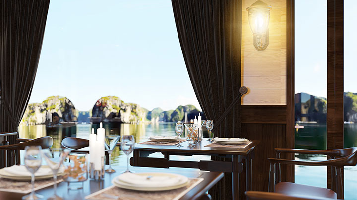 Du thuyền cũng sở hữu khu vực nhà hàng tuyệt vời, không gian thoáng đãng nhìn ra Vịnh, đồ ăn được chọn lọc từ những món ăn đặc trưng nhất của miền biển.