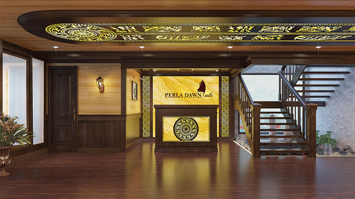 Là một du thuyền cao cấp mang tiêu chuẩn 5 sao, Perla Dawn hàm chứa trong mình sự tinh túy của nét phong cách phương Đông, trong khi đạt những chuẩn mực của sự tiện nghi, hiện tại theo tiêu chuẩn một khách sạn phương Tây. Đến với Perla Dawn, du khách có thể nhận thấy ngay nét đặc trưng mà hiếm du thuyền nào có được, đó là toàn bộ không gian được thiết kế bằng gỗ hoặc hoa văn giả gỗ. Không gian bên trong tràn ngập màu nâu trầm của vân gỗ, sự ấm áp của ánh đèn vàng dịu nhẹ. Tất cả tạo ra sự sang trọng của một căng phòng thượng hạng lênh đênh trên biển.