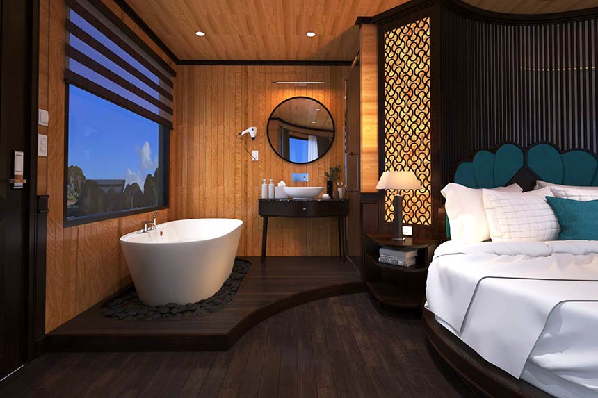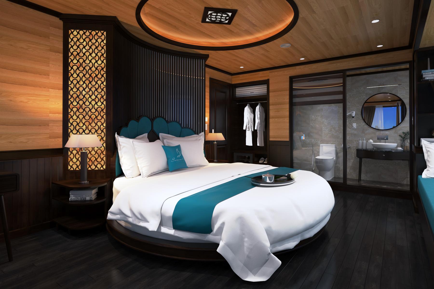 Nếu chuyến thưởng ngoạn trên du thuyền Serenity bạn đi cùng với người thương để hâm nóng lại câu chuyện tình yêu của mình hay là chuyến trăng mật ngọt ngào thì đừng bỏ qua phòng Moon Suite with Terrace nhé. Đây là 2 phòng duy nhất được bố trí trên tầng tượng của du thuyền được thiết kế theo phong cách hiện đại và sang trọng nhất.