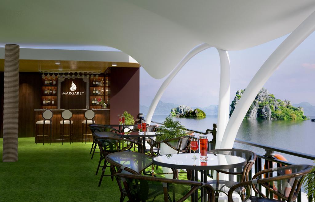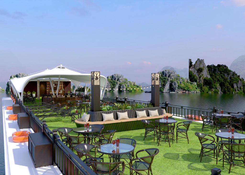 Điểm nhấn đặc biệt của Du thuyền chính là thiết kế một quầy bar ngoài trời. Tại đây, quý khách cùng những người thân yêu thư thái cảm nhận hương vị thơm nồng của một ly rượu vang rồi ngắm nhìn non nước ngay trước mắt. Không còn những xô bồ, vôi vã, không còn những bộn bề lo toan của cuộc sống thường nhật. Nơi đây chỉ còn lại sự an yên và tĩnh lặng. Con người ta dường như được hòa mình vào với thiên nhiên ấy.