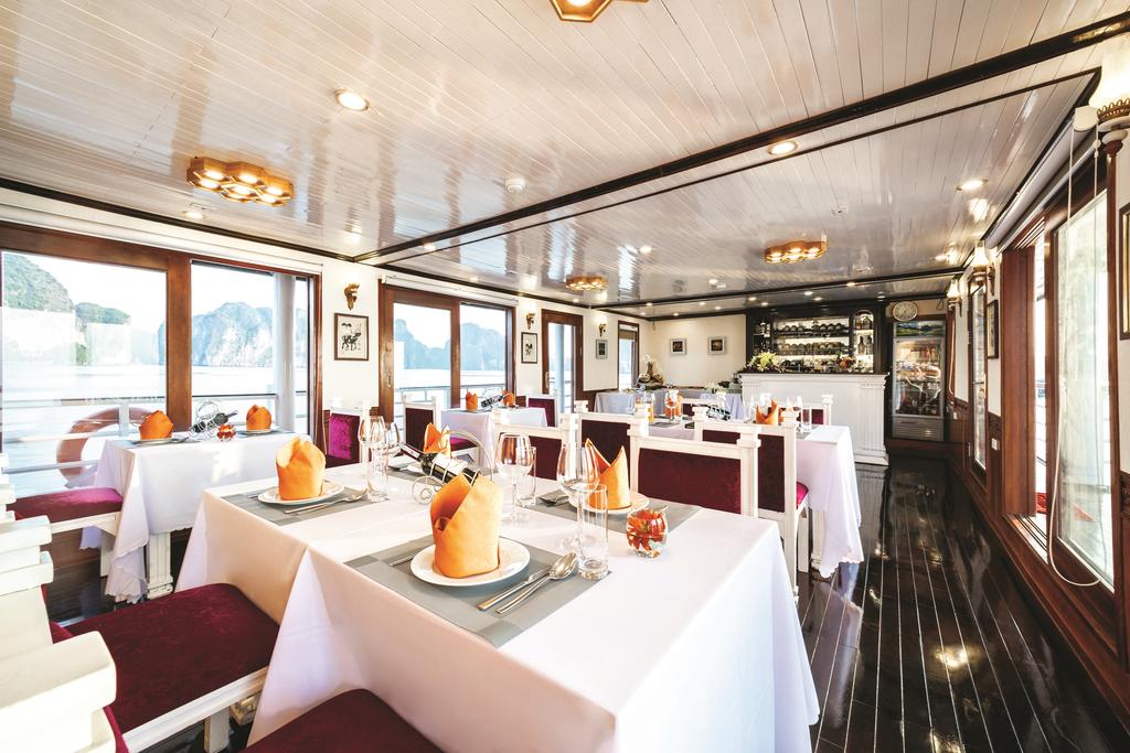 Vì toàn bộ lịch trình hầu hết đều ở trên du thuyền nên nhà hàng được xây dựng ngay trong khuôn viên để đảm bảo đáp ứng nhu cầu của du khách. Những bữa tiệc buffet, món Tây, món Trung Quốc cho tới món ăn truyền thống của Việt nam, đặc sản của Hạ Long đong đầy tình cảm của các đầu bếp tài hoa chắc chắn sẽ mang lại cho bạn những khoảnh khắc, những trải nghiệm khó quên.