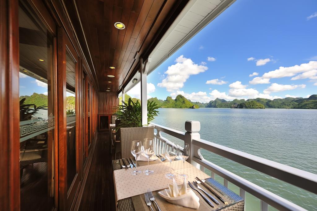 Mỗi cabin trên tàu đều sở hữu ban công rộng rãi, là nơi không thể tuyệt vời hơn cho việc ngắm hoàng hôn hay bình minh hoặc đơn giản là thưởng thức một ly trà nóng tận hưởng khí trời Hạ Long. Lấy ý tưởng từ việc giao hòa với thiên nhiên làm chủ đạo nên ngoài bố trí ban công rộng, tất cả các căn phòng đều xây dựng những cửa sở lớn giúp tối ưu nguồn ánh sáng và gió tự nhiên. Chắc chắn bạn sẽ vô cùng thích thú ngay khi bước chân vào căn phòng này!