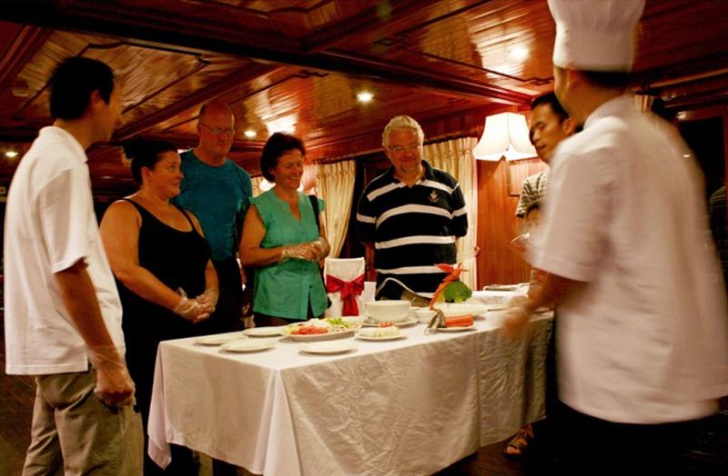 Sau những hoạt động đốt năng lượng tại bãi biển, hãy nhớ dành thời gian cho những hoạt động thư giãn khác tại du thuyền như tham gia một lớp học nấu ăn được hướng dẫn bởi những đầu bếp kinh nghiệm của vùng biển nhé. Đây là một cơ hội tốt để mở rộng kiến thức của bạn về văn hóa ẩm thực của người dân địa phương Hạ Long nói riêng và đất nước Việt Nam nói chung. Đây chắc chắn là một hoạt động hoàn hảo cho các bà nội trợ ưa thích những món ăn ngon đấy.