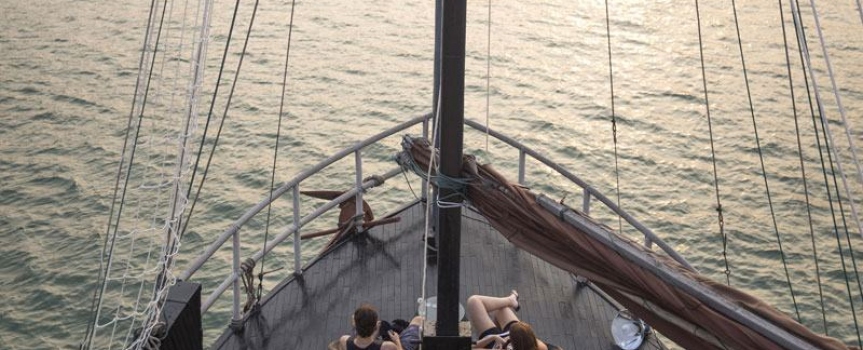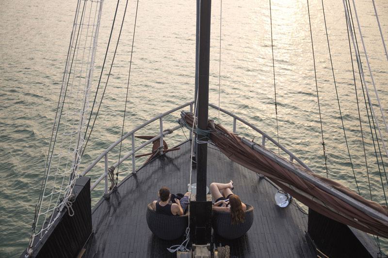 Ngắm hoàng hôn trên boong tàu. Đây là thời điểm lý tưởng cho những du khách thích giao lưu, kết bạn, chia sẻ những trải nghiệm du lịch hoặc chỉ đơn giản là ngắm cảnh mặt trời lặn.