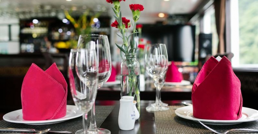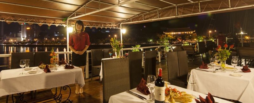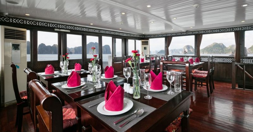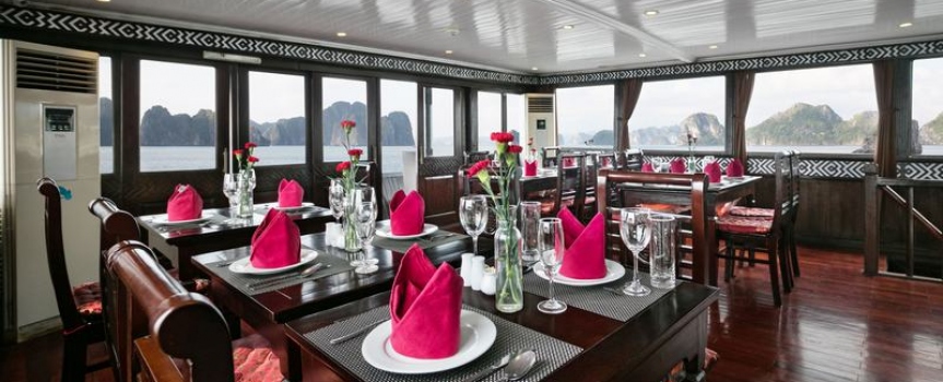 Các bữa ăn trên du thuyền đều được chế biến từ những nguyên liệu tươi ngon và giàu dinh dưỡng, với bữa sáng buffet tự chọn và bữa trưa, bữa tối luôn đa dạng với những món ăn đầy đặn, ngon miệng và hợp khẩu vị với mọi du khách. Những du khách có nhu cầu ăn chay, ăn kiêng hoặc dị ứng với hải sản sẽ được cung cấp thực đơn riêng với nhiều sự lựa chọn phong phú.