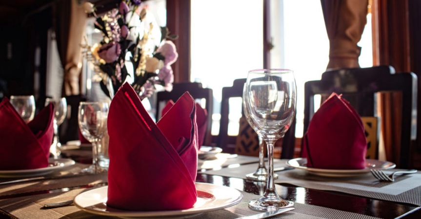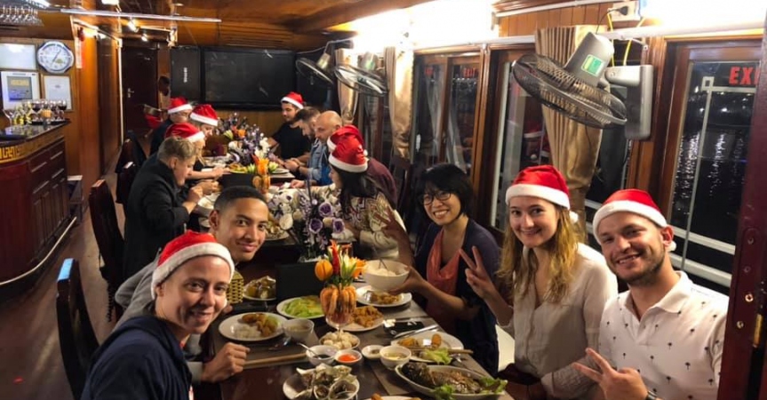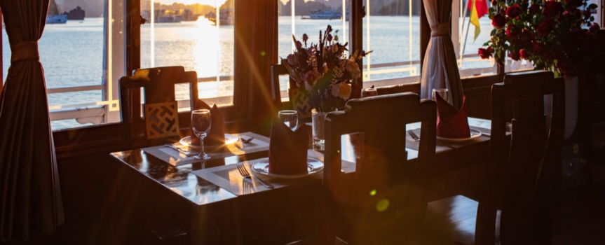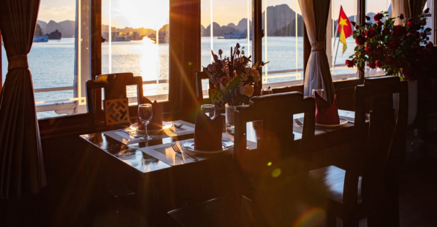 18:30: Du khách thưởng thức bữa tối trên du thuyền Cozy Bay với những món ăn đặc sản của nơi đây.
