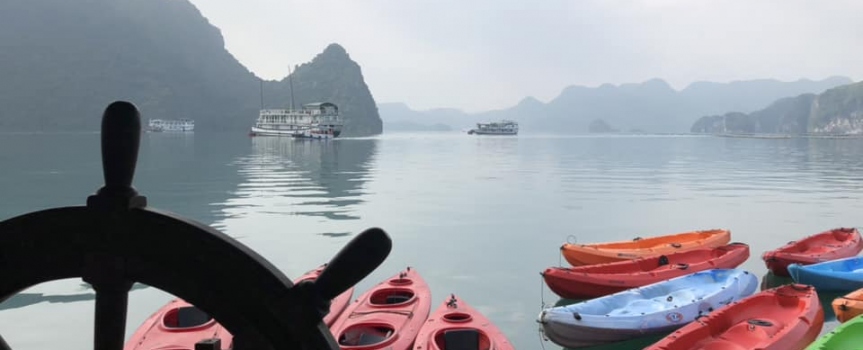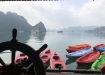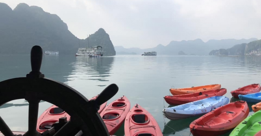 7:45: Du khách tham gia hoạt động giải trí chèo xuồng kayak, một trong những hoạt động thú vị nhất trên Vịnh Hạ Long.