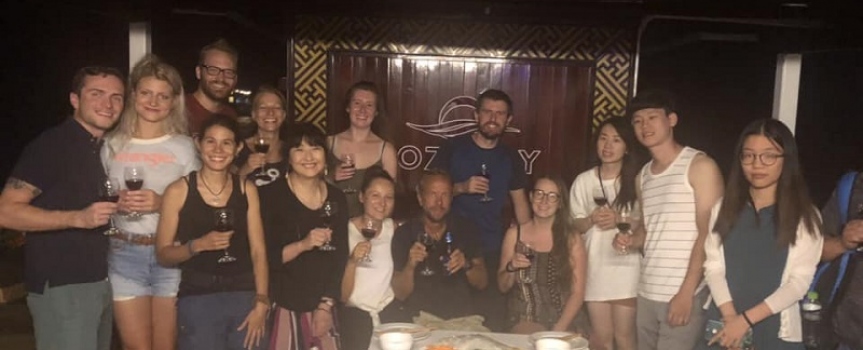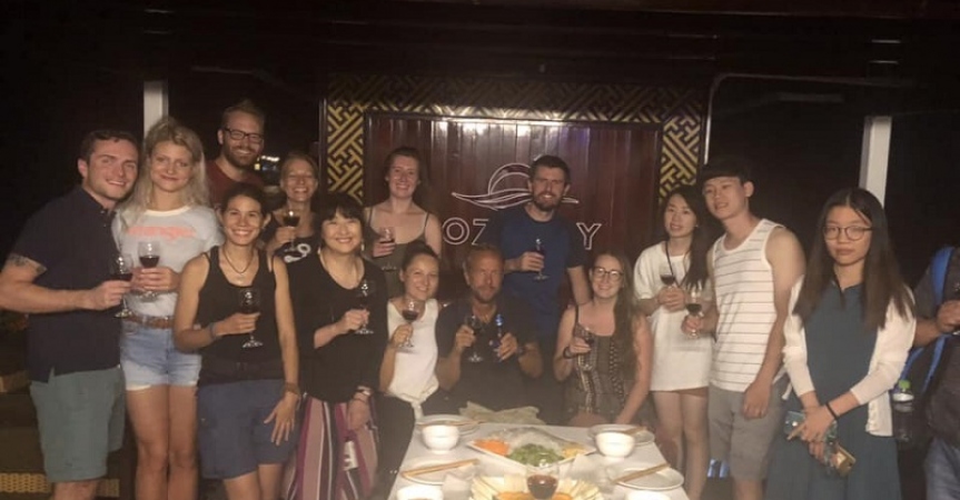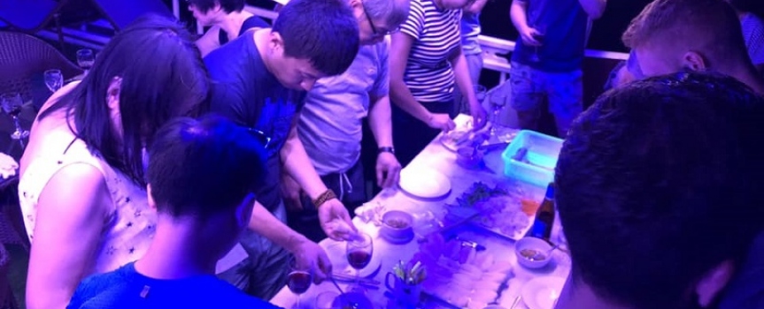 17:00: Sau khi thăm quan đảo TiTop tàu nhỏ sẽ đưa du khách quay trở lại Du thuyền Cozy Bay. Du khách tắm rửa,nghỉ ngơi trên sundeck ngắm nhìn cảnh hoàng hôn trên Vịnh Hạ Long. Cùng với đó là thưởng thức tiệc Party với rượu vang vàhoa quả. Sau đó đến chương trình cooking class, Hướng dẫn viên sẽ dạy du khách cách để cuốn và thưởng thức món “nemcuốn” – Một trong những món ăn rất nổi tiếng và được ưa thích của Việt Nam.