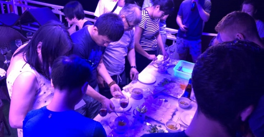 Hình ảnh du khách nhiệt tình tham gia làm món nem cuốn.