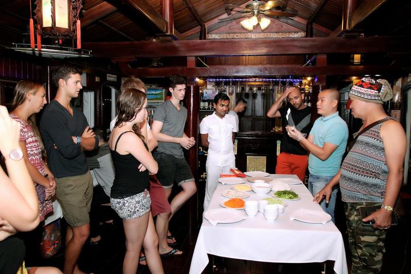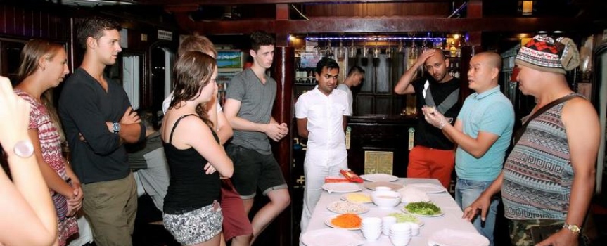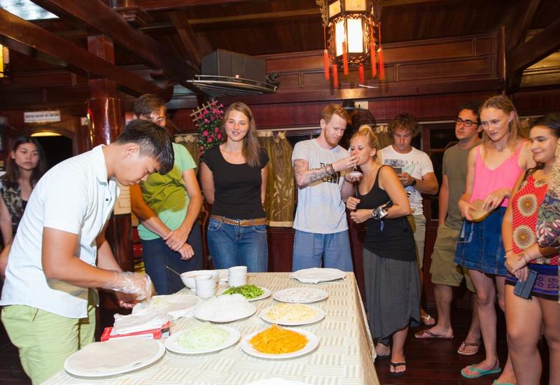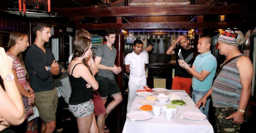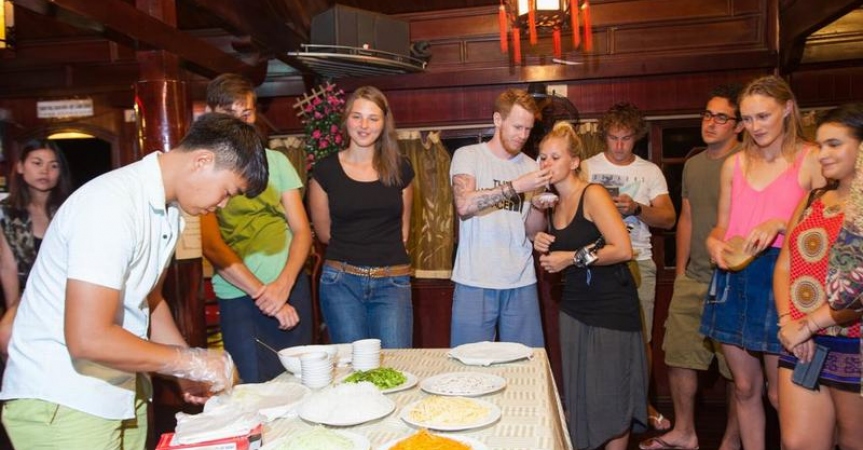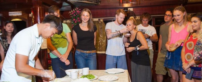 Trước bữa tối, mời quý khách tham gia lớp học nấu ăn trên tàu với đầu bếp của chúng tôi, “bỏ túi” một vài món ăn mới để trổ tài cùng người thân và gia đình.