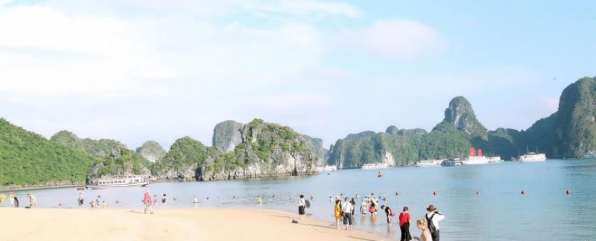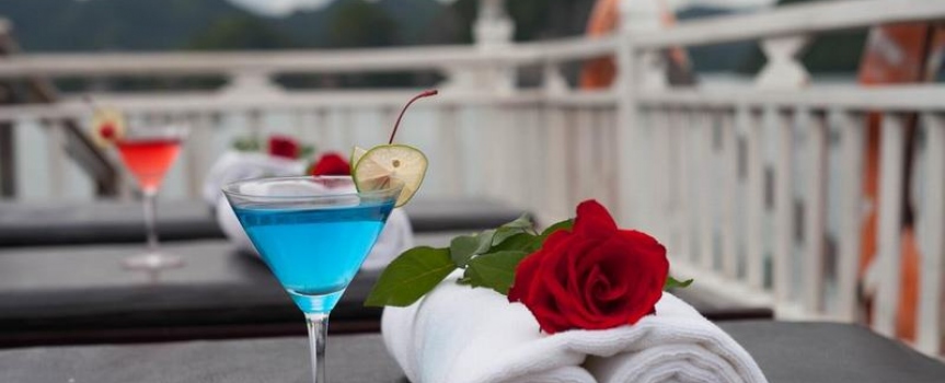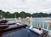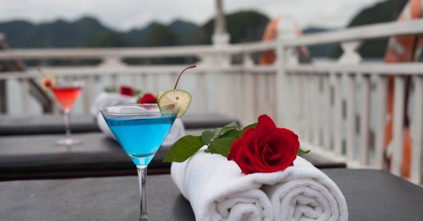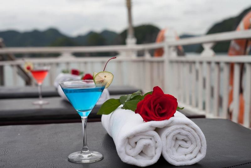 - Tàu thả neo ở đảo Soi Sim hoặc bãi Titop, quý khách thoả thích tắm biển và chụp hình, gặp vùng nước lặng, tàu sẽ thả neo dừng lại để quý khách lên trên boong tàu ngắm cảnh hoàng hôn hùng vĩ trên vịnh Hạ Long, nhâm nhi ly rượu vang và thưởng thức hoa quả tươi theo mùa.