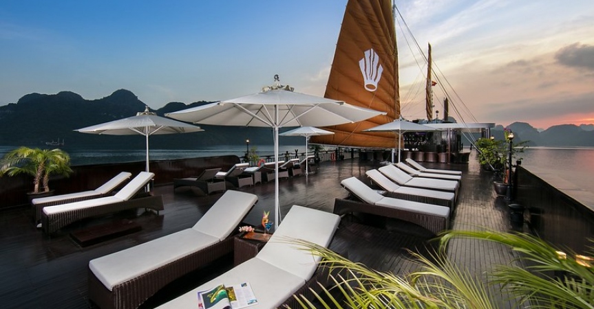 Quay trở lại Regal Cruise, du khách tiếp tục hành trình khám phá vẻ đẹp tiềm ẩn khác của Vịnh Hạ Long - Vịnh Lan Hạ. Quý khách có thể chọn nhâm nhi coctail trên boong tắm nắng hoặc thư giãn trong cabin với tầm nhìn cực lớn ra các hòn đảo nhỏ màu xanh lá cây.