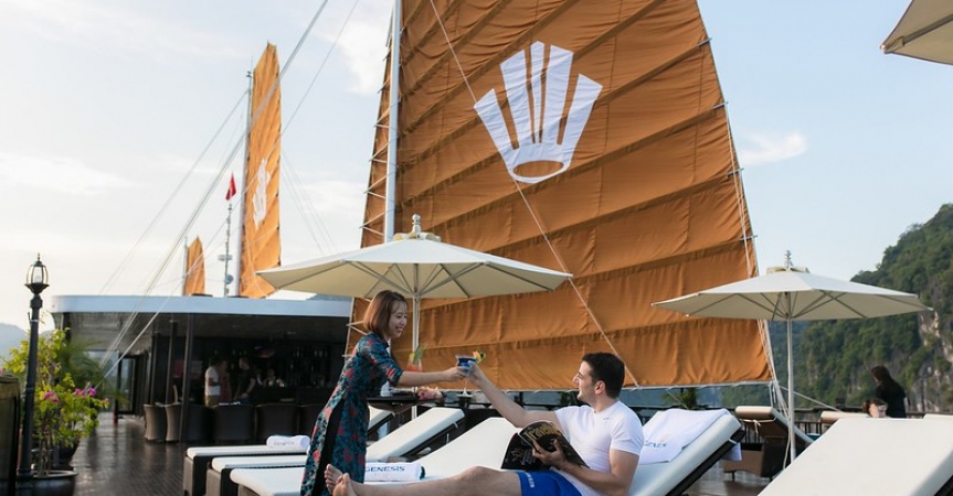 18h00 Thư giãn trên boong tàu sau một ngày khám phá vịnh với nhiều hoạt động. Tham gia lớp học nấu ăn, học cách làm món nem rán.