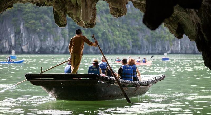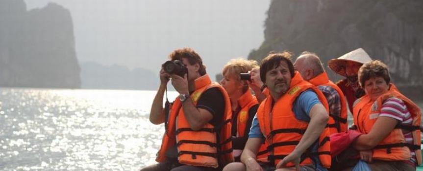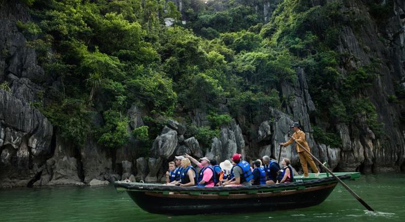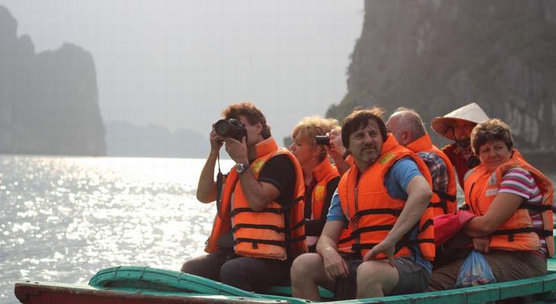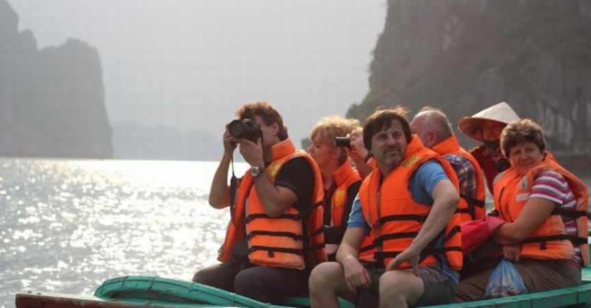 Đồ uống chào mừng – nghe tóm tắt các hướng dẫn an toàn trên tàu và làm thủ tục check in. Tàu nhổ neo, đưa hành khách tiến sâu vào trong vịnh.