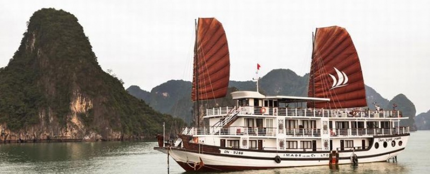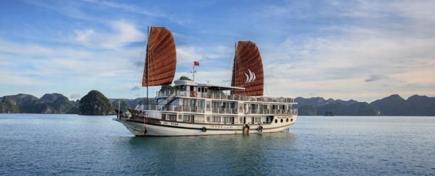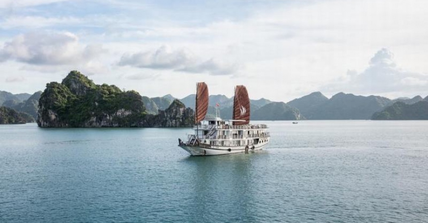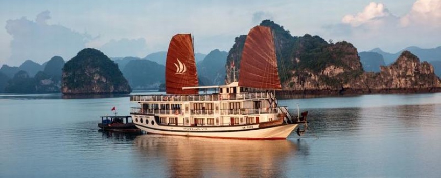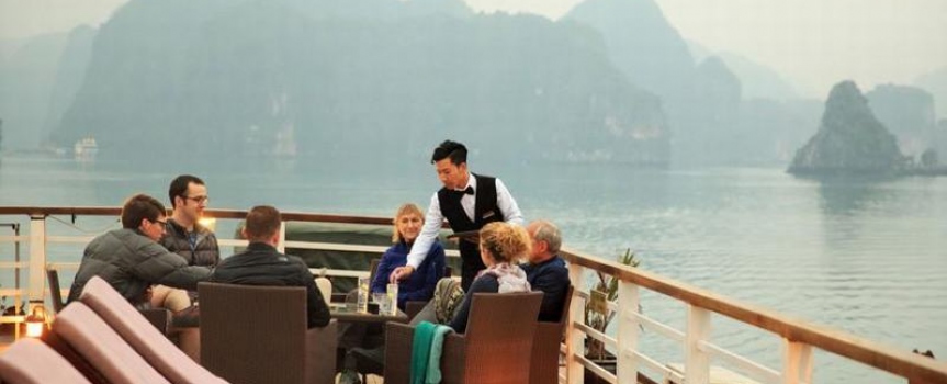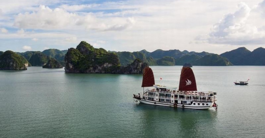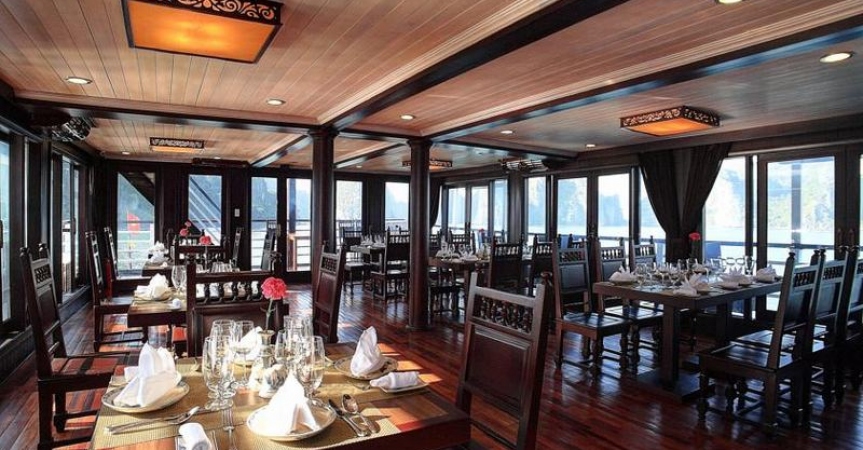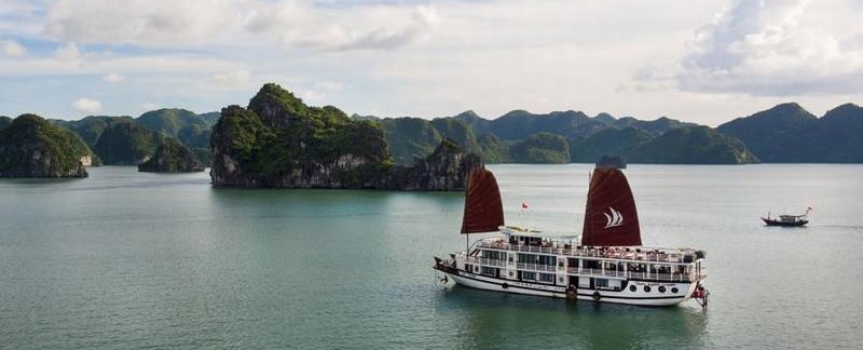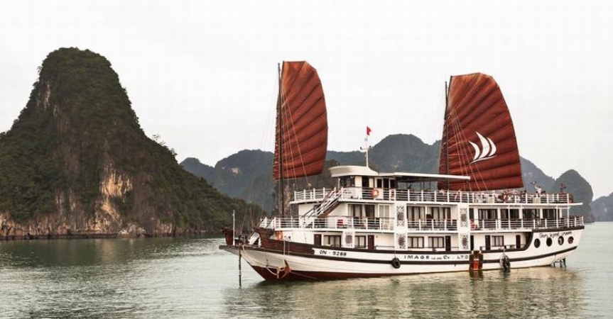 Dùng bữa trưa với các món ăn Việt Nam trong khi tàu đi qua các hòn đá vôi tuyệt đep đặc trưng của Vịnh Hạ Long như Hòn Đinh Hương, Hòn Chó Đá, Gà Chọi, bãi biển Soi Sim, đảo Ba Trái Dừa.