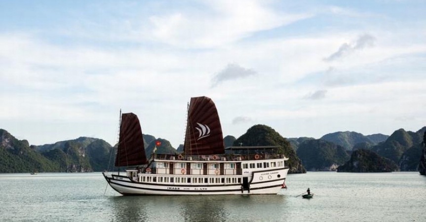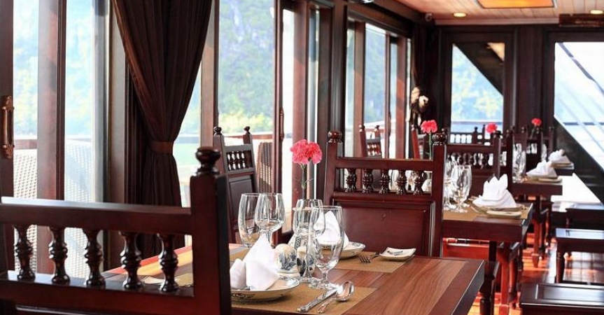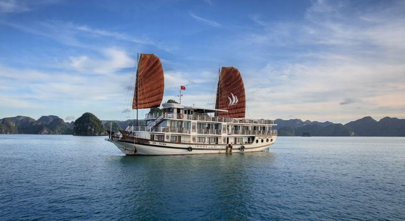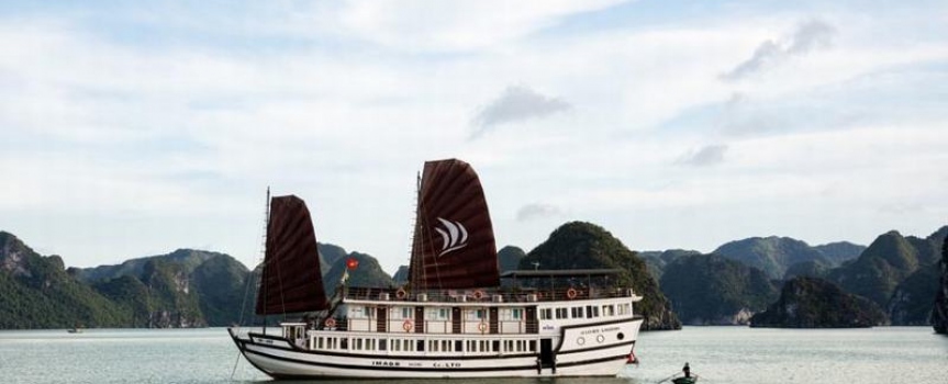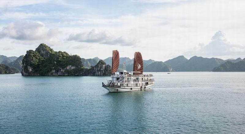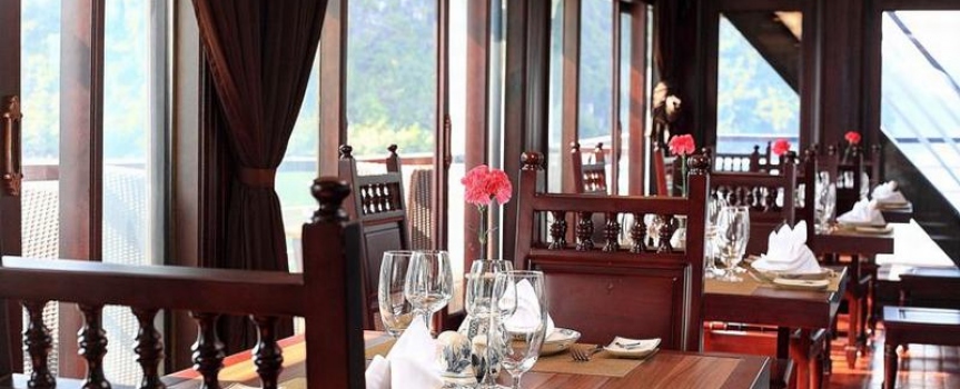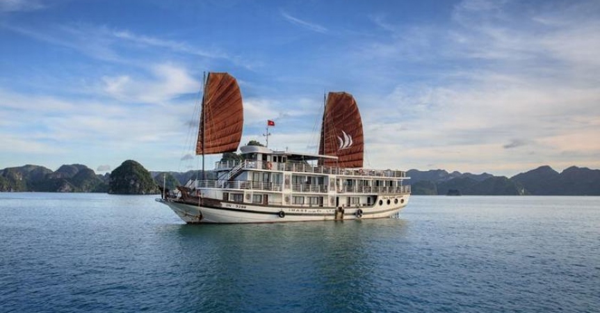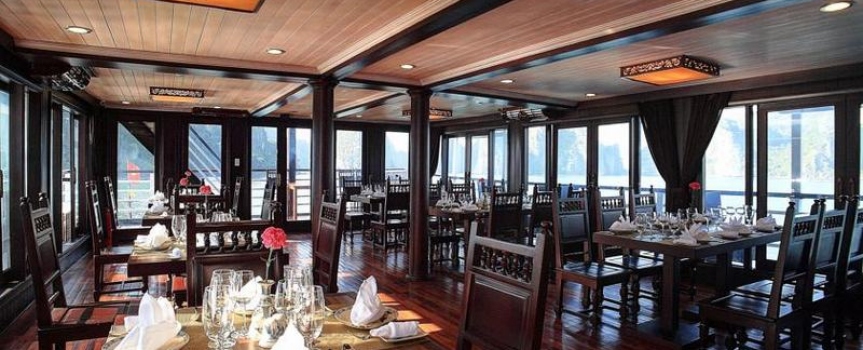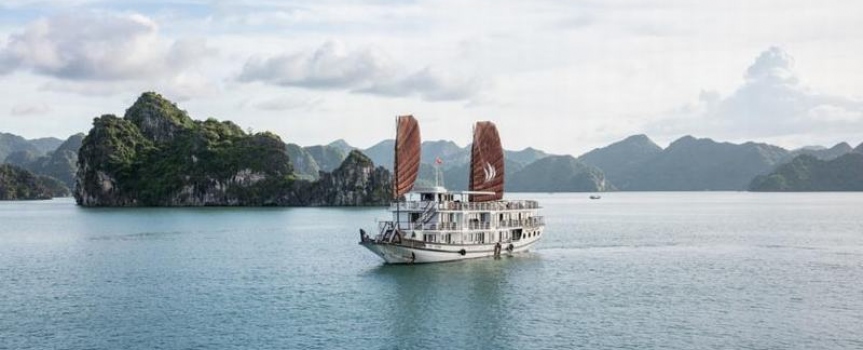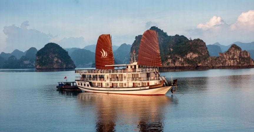 Dùng bữa trưa với các món ăn Việt Nam trong khi tàu đi qua các hòn đá vôi tuyệt đep đặc trưng của Vịnh Hạ Long như Hòn Đinh Hương, Hòn Chó Đá, Gà Chọi, bãi biển Soi Sim, đảo Ba Trái Dừa.