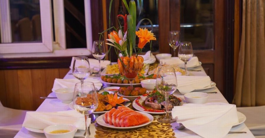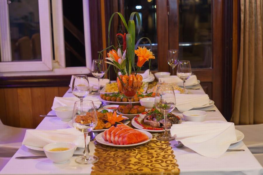 -Thưởng thức bữa trưa với nhiều món hải sản tươi ngon sẽ được phục vụ tại nhà hàng trong khi tàu đưa quý khách đi tham quan quanh vịnh Hạ Long.