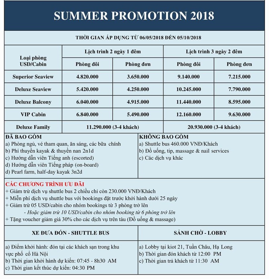12:30 Quý khách lên tàu, thưởng thức đồ uống chào mừng, nghe thong báo lịch trình tóm tắt và check in.