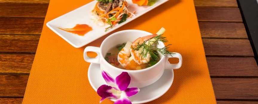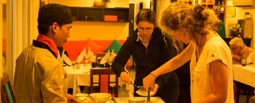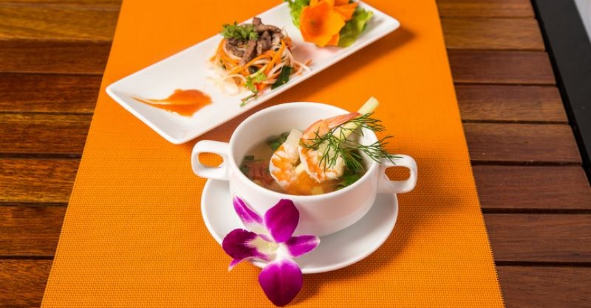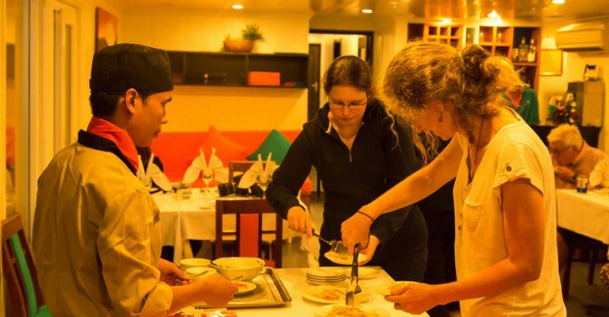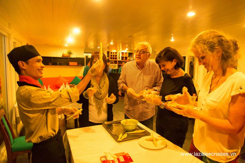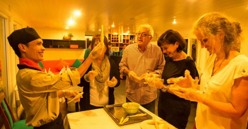 18:00 Đội nhân viên phụ trách ẩm thực trên tàu sẽ biểu diễn cách làm các món cuốn Việt Nam – phở cuốn và khắc trái cây.