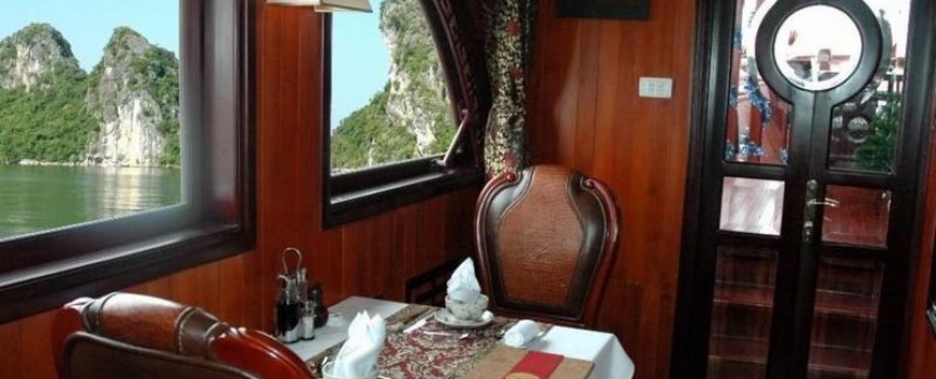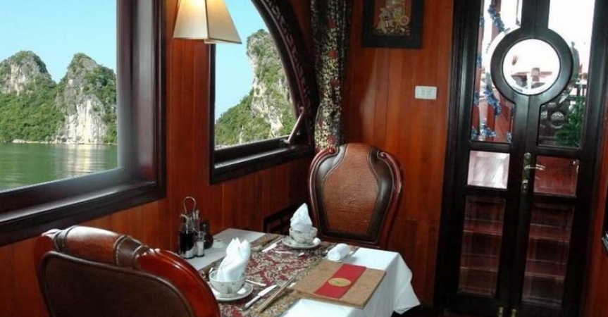 Khu vực nhà hàng ở trong và trên sundeck có vị trí tuyệt vời để du khách có thể thưởng thức các món ăn thơm ngon và ngắm nhìn khung cảnh tuyệt vời của các núi đá vôi ngoạn mục trên biển xanh mênh mông.