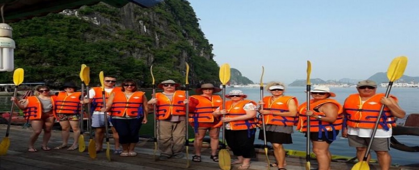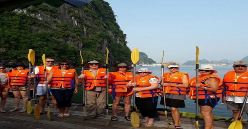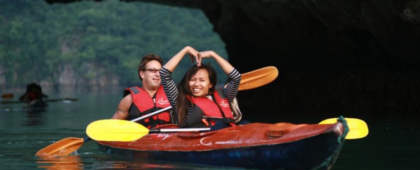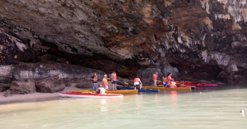 10h00: Tham gia chèo kayak tại khu vực Hồ Động Tiên khoảng 45 phút, sau đó trở về tàu để thưởng thức bưa trưa.