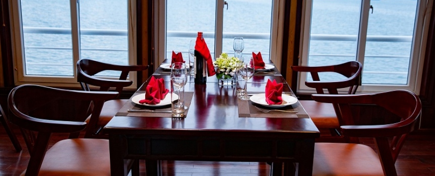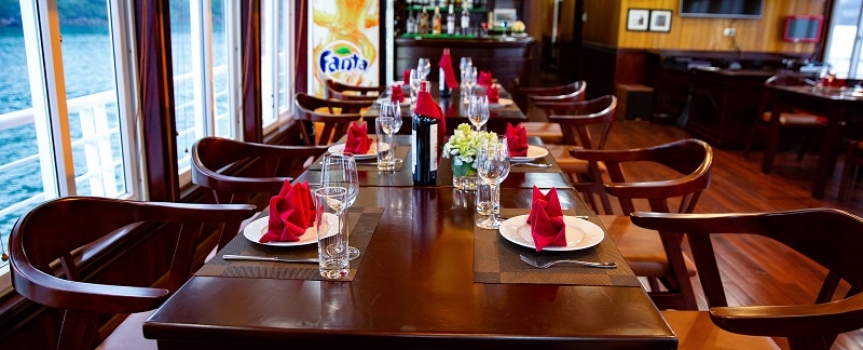 13h15 Thưởng thức bữa trưa trên tàu với nhiều món hải sản tươi ngon, trong khi du thuyền dời cảng ra vịnh.Du thuyền sẽ đưa du khách đi qua những thắng cảnh nổi tiếng của Vịnh Hạ Long như hòn Chó Đá, Hòn Đỉnh Hương, Hòn Gà Chọi...
