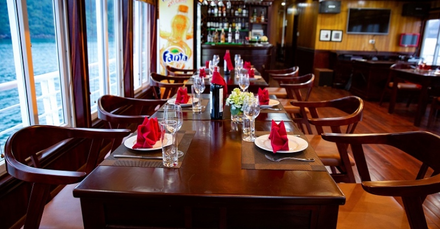 12h00: Quý khách dùng bữa trư trên tàu trong khi du thuyền di chuyển đến làng Ngọc Trai.