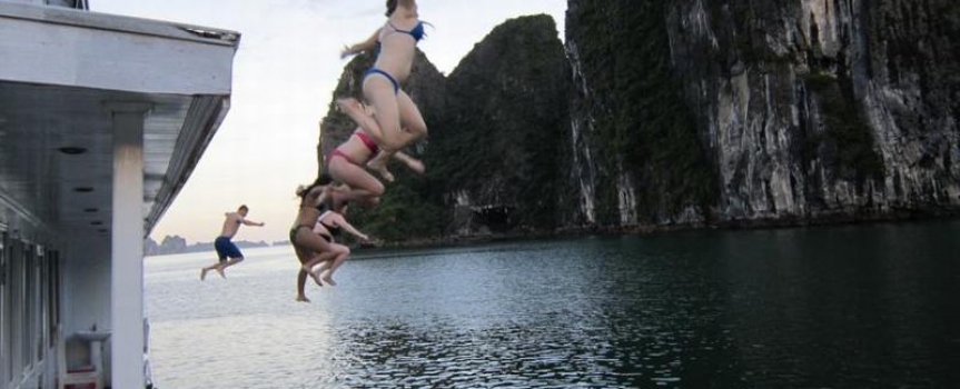 17:30 Quay trở lại tàu, quý khách tham gia Sunset Party trên boong tàu với hoa quả tươi phục vụ miễn phí. Sau đó, quý khách sẽ dùng bữa tối trên tàu.