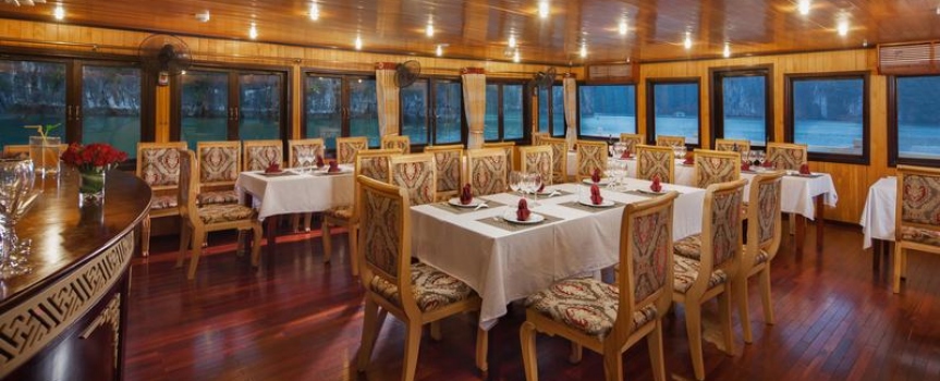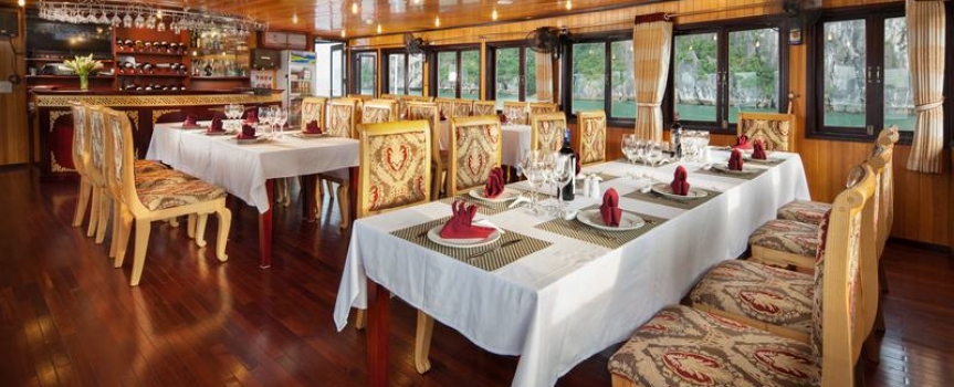 13:00 Quý khách dùng bữa trưa tại nhà hàng trên tàu, thưởng ngoạn cảnh thiên nhiên hùng vỹ của Vịnh Hạ Long trong khi tàu tiến sâu vào trong vịnh.