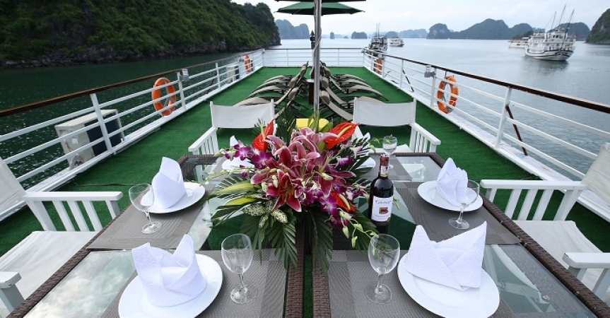 13:30. Ăn trưa trong khi thuyền di chuyển đến Vịnh Bái Tử Long,đồng thời chiêm ngưỡng những tảng đá tuyệt đẹp trong vịnh.