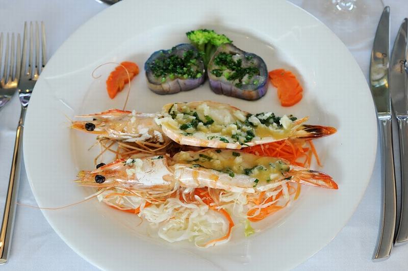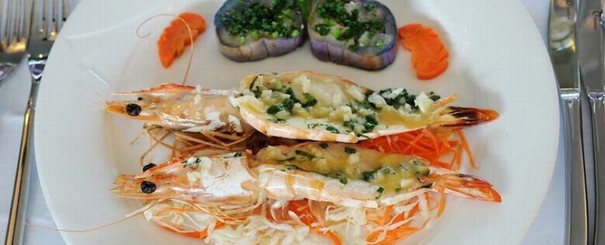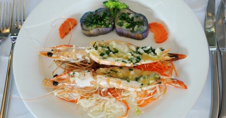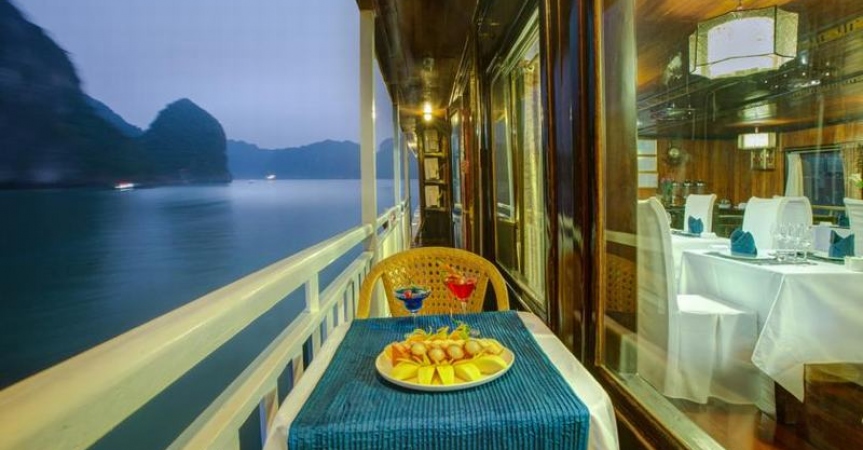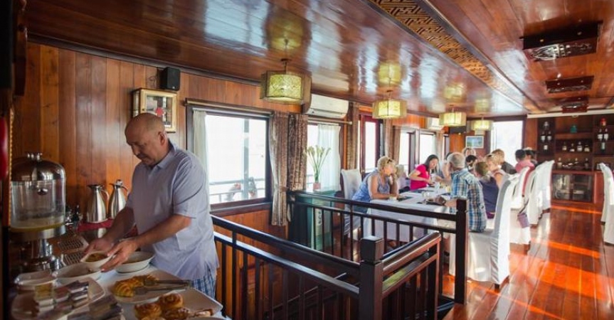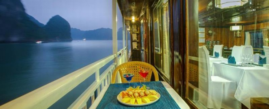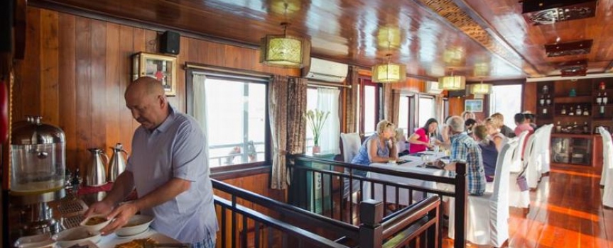 Thực đơn trong mỗi bữa ăn đều bao gồm những món hải sản tươi ngon nhất - đặc sản của vùng biển Hạ Long. Du khách sẽ được thưởng thức những bữa ăn tuyệt ngon trên con tàu chất lượng này.