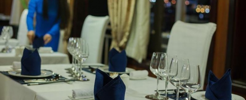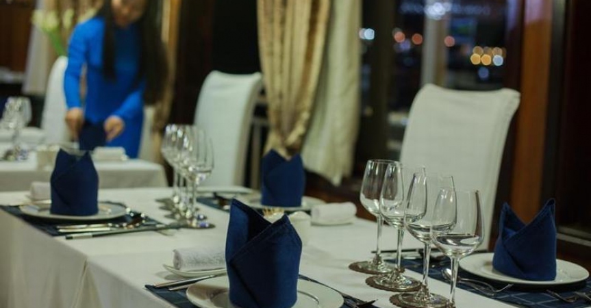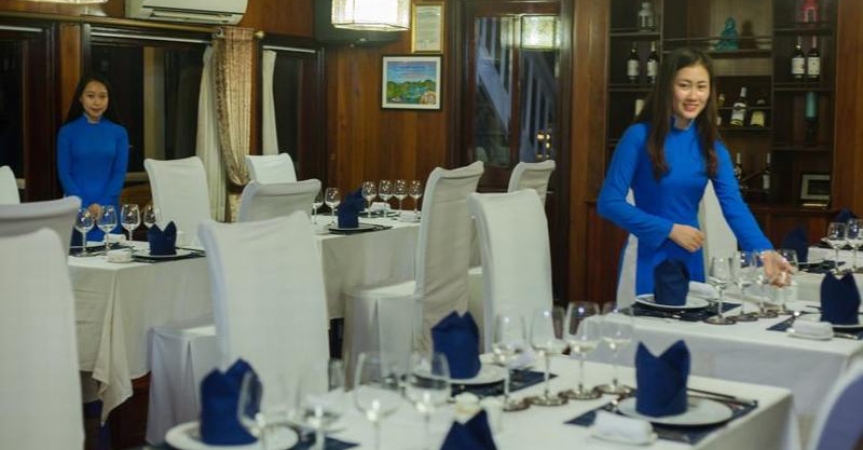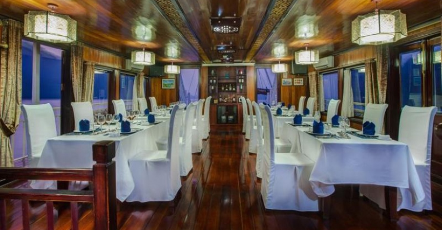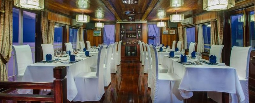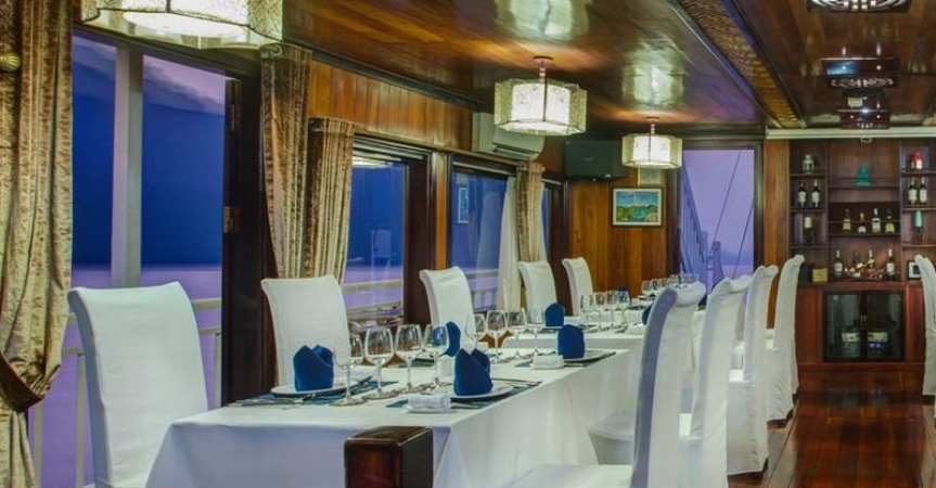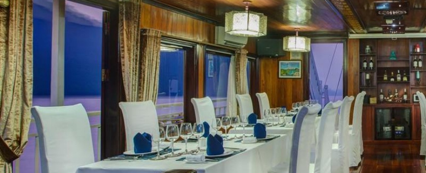 Du thuyền Flamingo 4 sao có khu nhà hàng và quầy bar được bài trí rất đẹp mắt với màu trắng và xanh kết hợp tạo vẻ thanh lịch nhưng vẫn không kém phần tinh tế và sang trọng. Nhà hàng là nơi mang đến những bữa ăn ngon miệng và dinh dưỡng nhất với sự phục vụ tận tình của đội ngũ nhân viên, chắc chắn sẽ đem lại sự hài lòng cho Quý du khách.