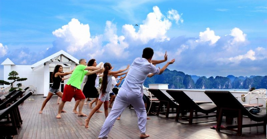 06h30: Thức dậy, tận hưởng khoảnh khắc buổi sáng sớm trên Vịnh Hạ Long hoặc tham gia lớp học thể dục dưỡng sinh trên boong tàu.