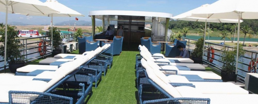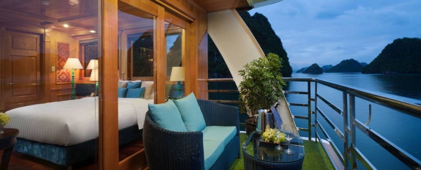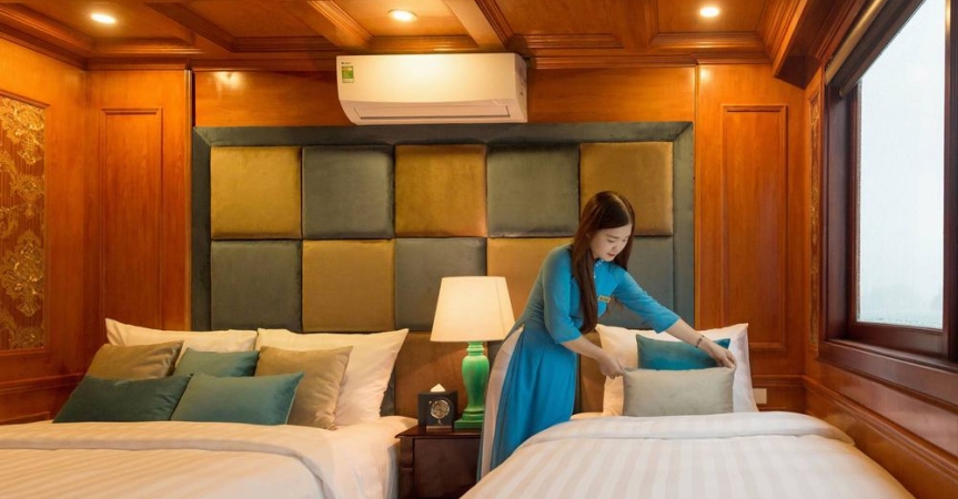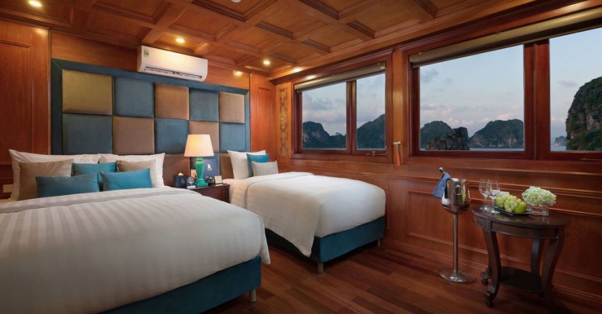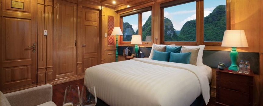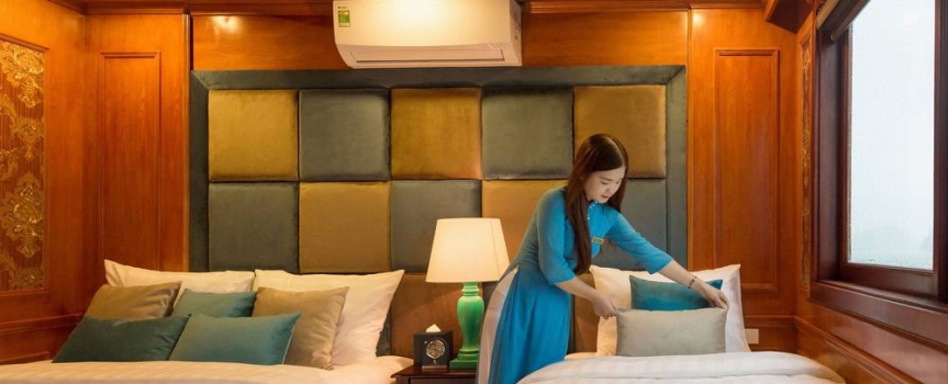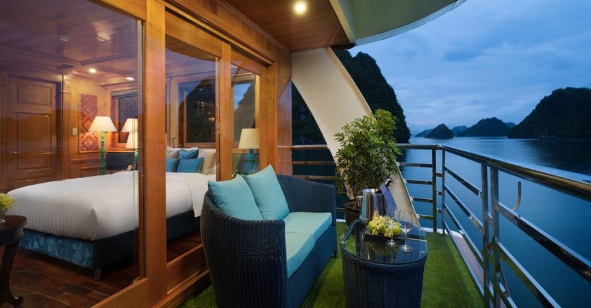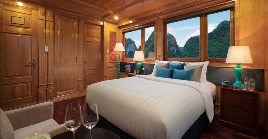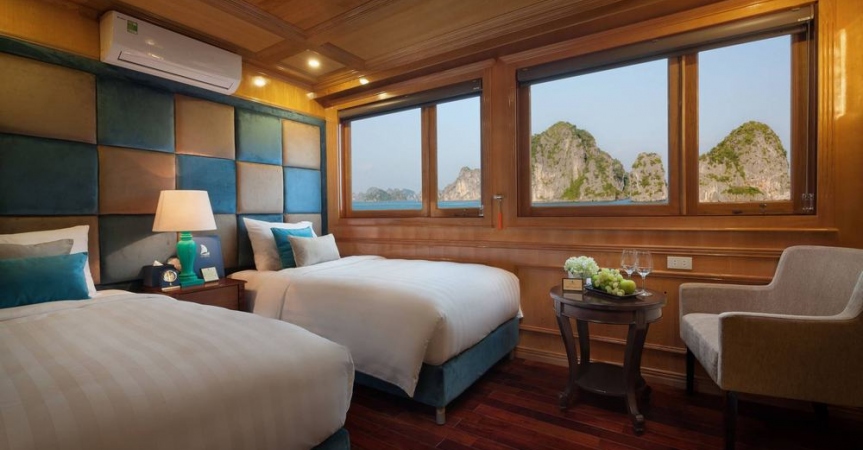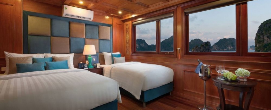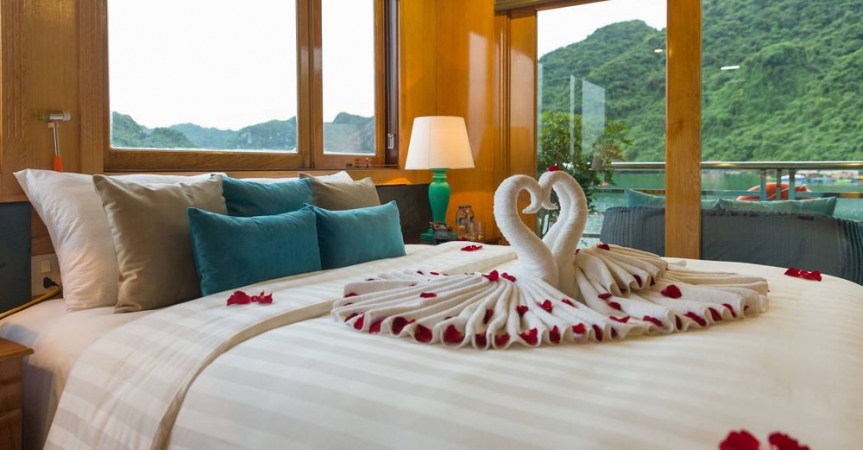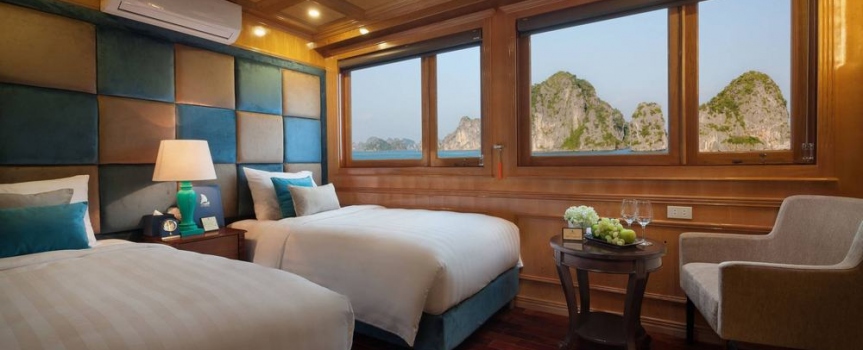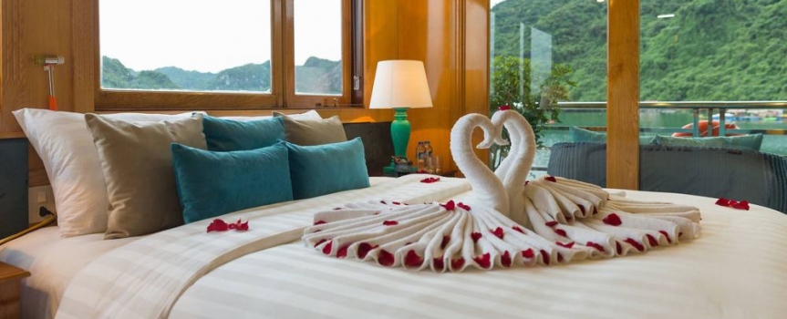12h15: Quý khách lên tàu và làm thủ tục nhận phòng, thưởng thức bữa tiệc chào mừng; nghe thủy thủ và quản lý giới thiệu về tàu và hướng dẫn các quy tắc an toàn trong khi tàu bắt đầu đưa quý khách đi tham quan vịnh Lan Hạ và vịnh Hạ Long.