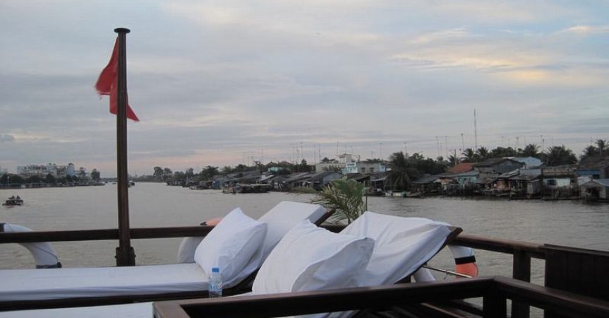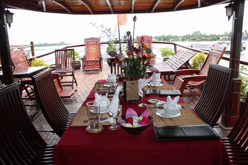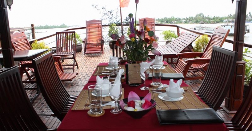 Ngoài được thưởng thức những món ăn đặc sản tại cù lao, du khách sẽ được “chiêu đãi” một bữa tiệc thịnh soạn ngay tại nhà hàng trên du thuyền. Với không gian rộng rãi, thoáng mát, vừa được thưởng thức những món ăn vùng miền, vừa được nghe đờn ca tài tử, vừa được thả mình vào thiên nhiên sông nước hữu tình thì quả là một trải nghiệm tuyệt vời phải không. Ngoài ra du khách còn được trải nghiệm các dịch vụ giải trí ngay trên du thuyền như câu cá, đọc sách, ngắm hoàng hôn, spa thư giãn, xông hơi và nghỉ ngơi tại một căn phòng thoải mái, đầy đủ tiện nghi.