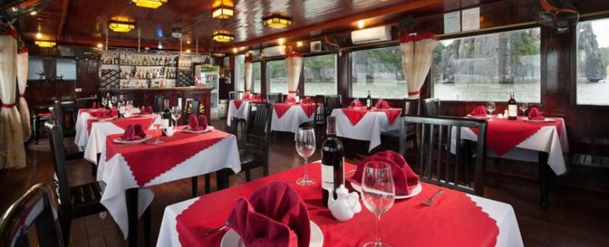 19h00: Bữa tối buffet được phục vụ tại nhà hàng trên tầng 2 của tàu trong không gian lãng mạn.