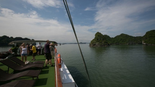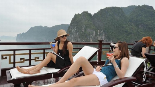 Du khách có thể ngồi tại phòng nhìn ra cửa sổ hoặc ngồi trên sundeck để ngắm trọn vẹn vẻ đẹp của Vịnh Hạ Long từ nơi cao nhất của du thuyền.