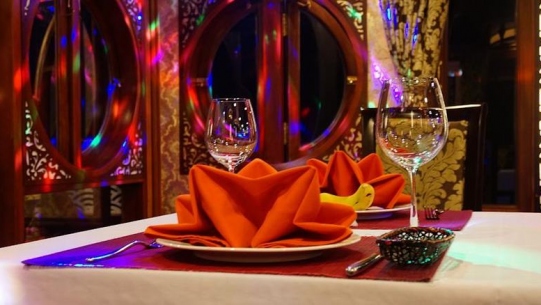 Nhà hàng và quầy bar trên Oriental Sails mang phong cách kiến trúc đậm chất phương Đông với màu nâu chủ đạo tạo cảm giác hoài cổ, nhưng vẫn sang trọng tạo nên sức hút riêng có.