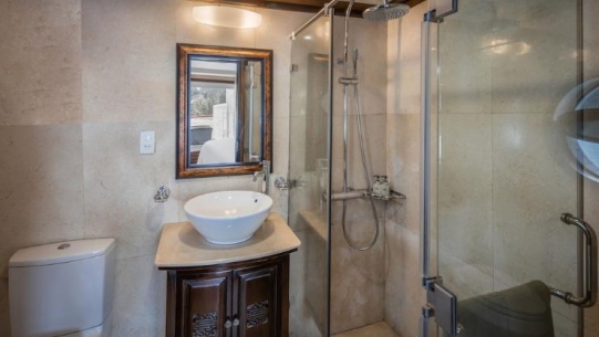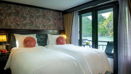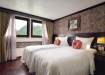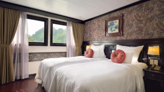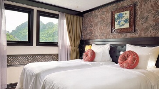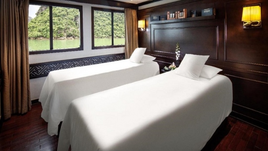 Cabin description– Số cabin: 24 (6 trên mỗi tàu) – Vị trí: tầng 1 – Diện tích: 16m² – Loại giường: Twin hoặc Double – Sức chứa tối đa mỗi phòng: 2 người lớn + 1 trẻ em dưới 12 tuổi (extra bed - kê giường phụ, sẽ tính thêm phí, trẻ em từ 5-11 tuổi tính phí tùy thời điểm, trẻ em dưới 5 tuổi miễn phí) ![]() Cabin facilities